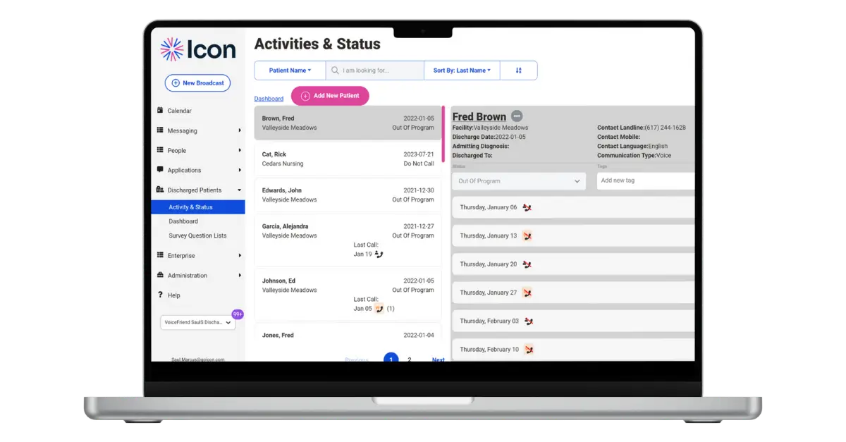 Upload a list of your discharged patients – or better yet – integrate Icon with your EHR to automatically update and manage communications.