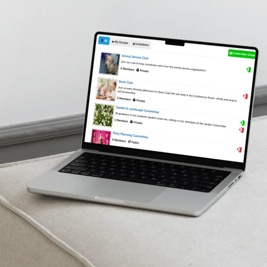 Residents are able to create and manage their own internal groups. Instilling independence and promoting connection.